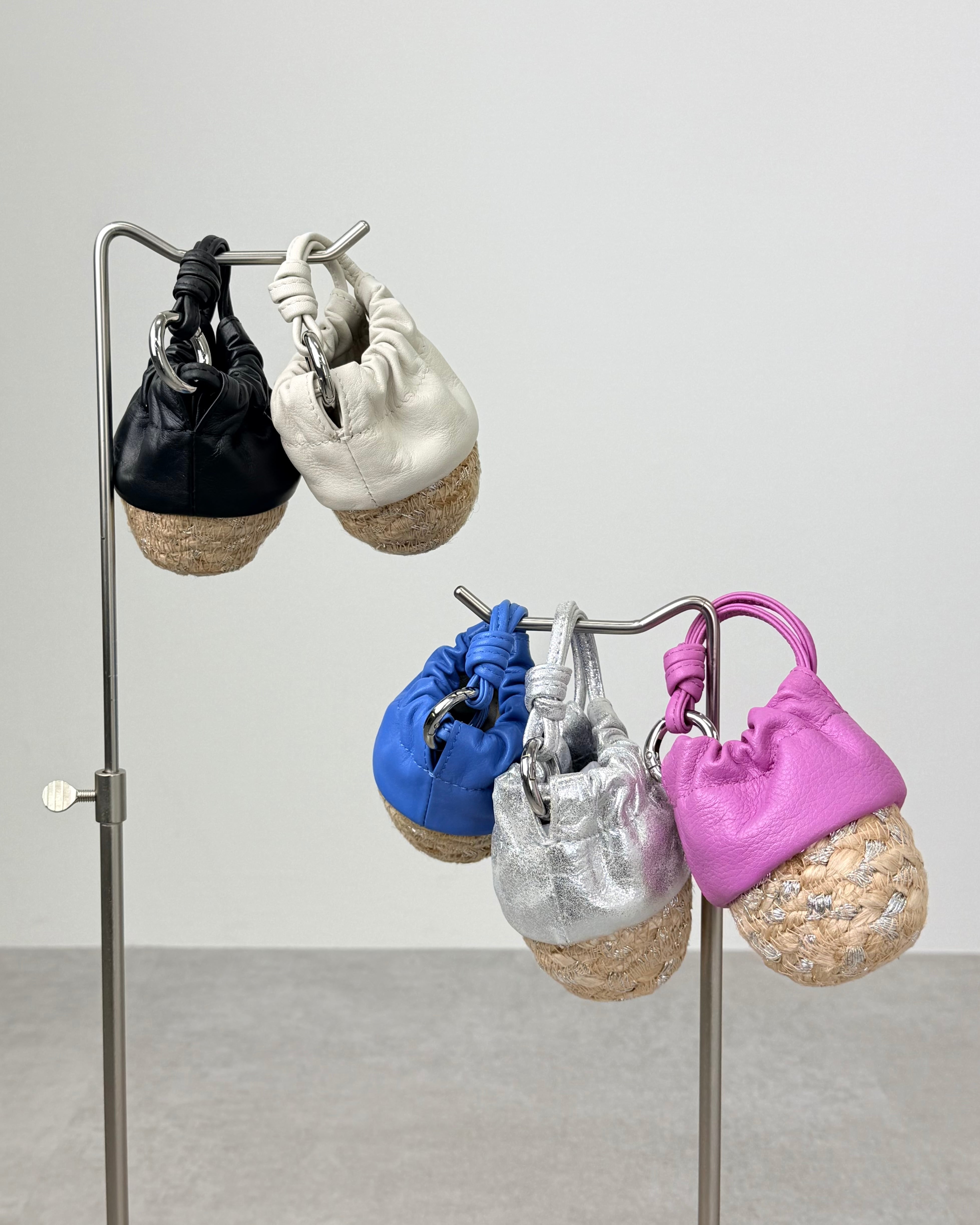 ▪ハンドメイドの小さなジュート素材のかごにレザー巾着を組み合わせたデザイン。